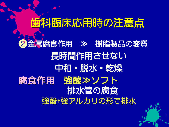 主に金属への腐食作用が欠点とされるが、配管材料、などを除けば 長時間作用させる必要はないので中和脱水乾燥の手順で腐食を
