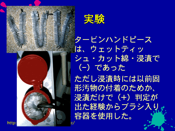 タービンハンドピースは、ウェットティッシュ カット綿 浸漬ともマイナスとなった。ただし、浸漬時には以前固形汚物付着のためか(+)判定が出た経験からブラシ入り容器を使用した。